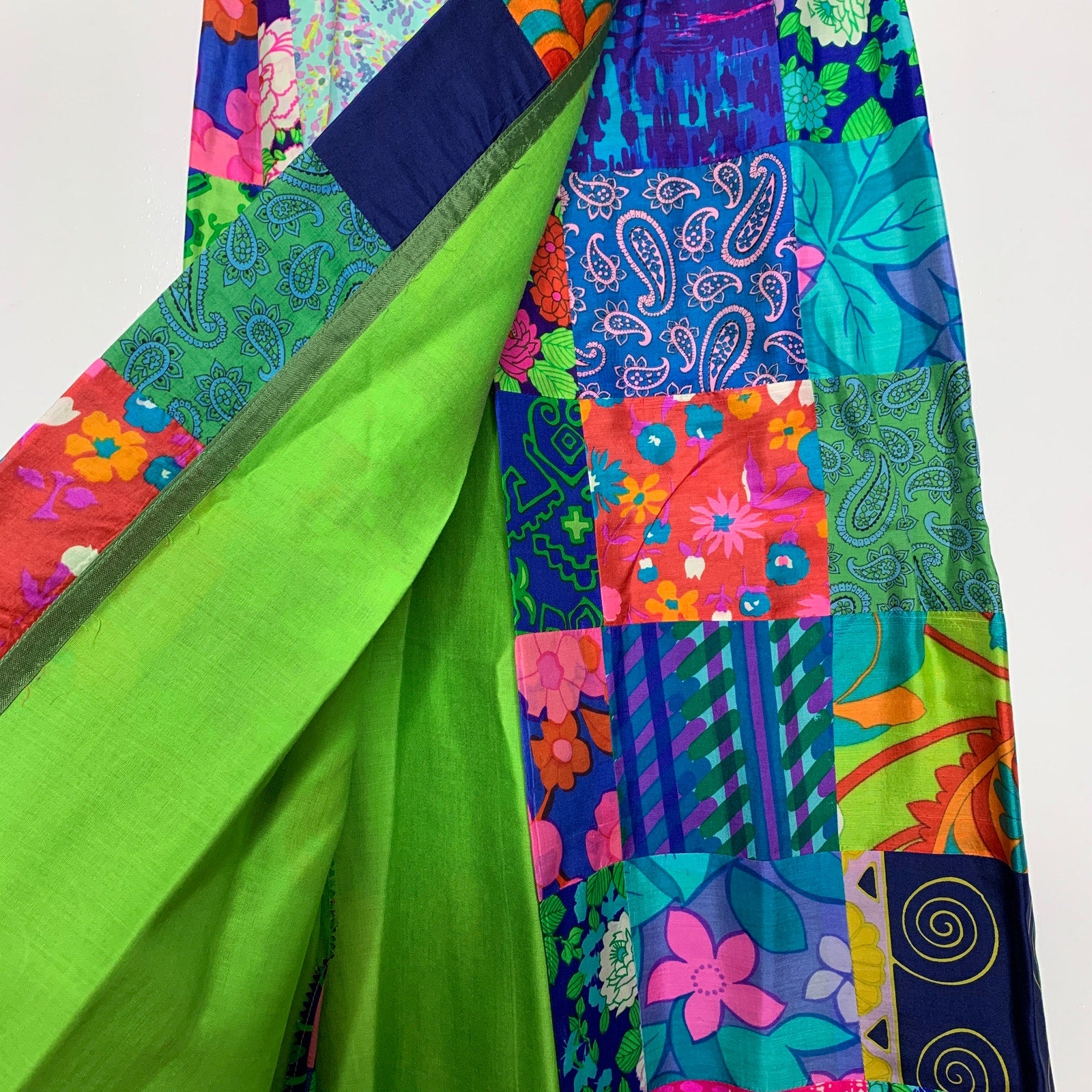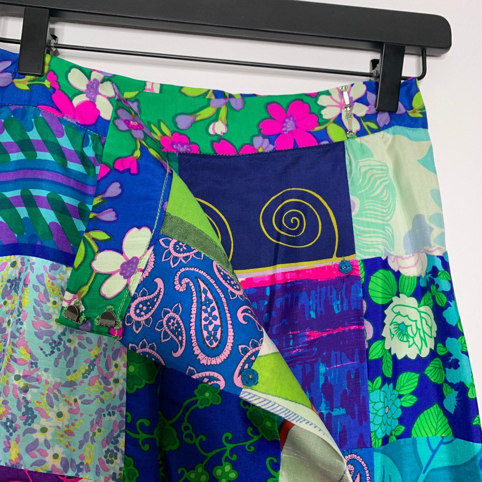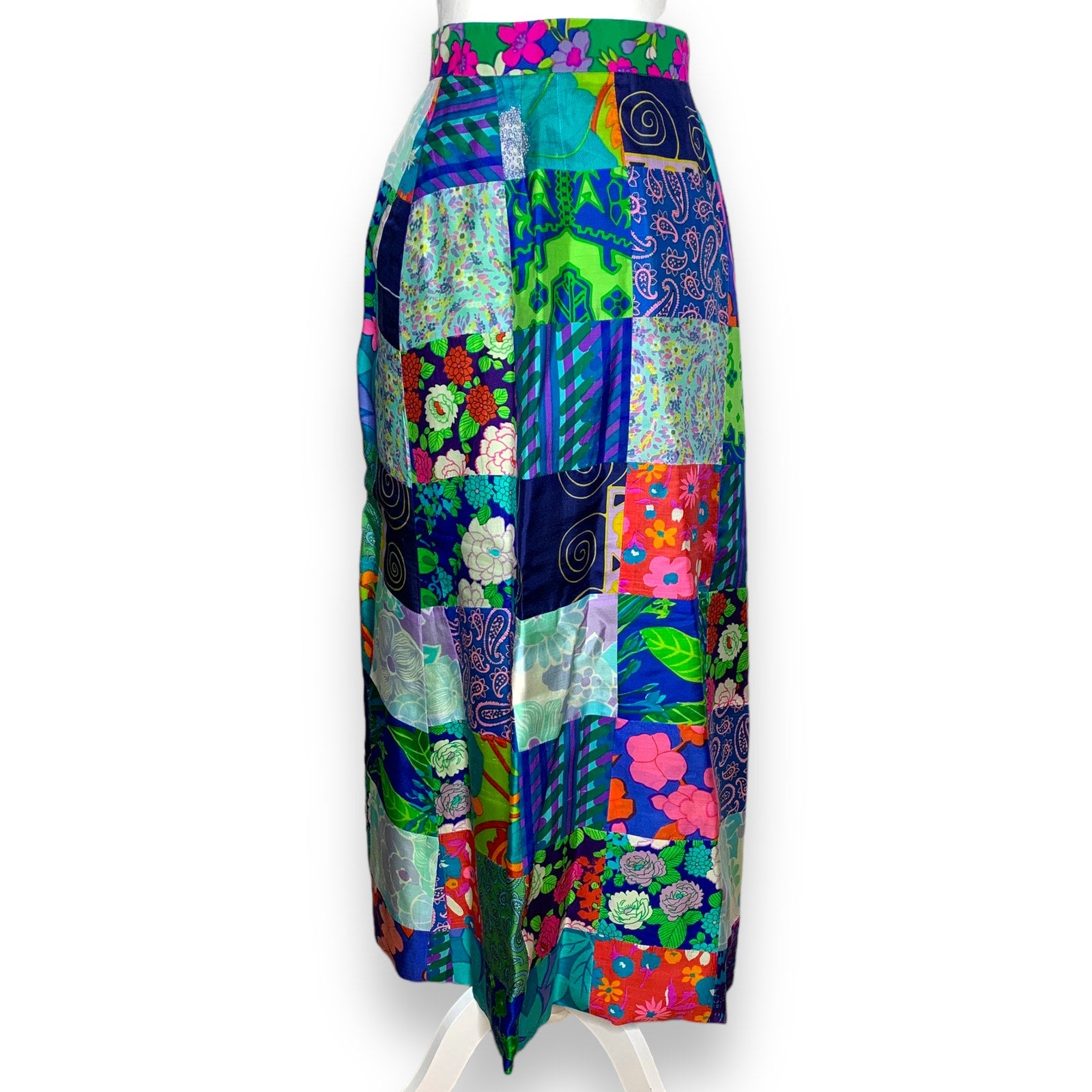 Step into timeless boho charm with this Vintage 60s Tegler's silk patchwork wrap maxi skirt. Its floor-length design flows gracefully, while the wrap style with secure bar hooks and snaps ensures a perfect fit. Fully lined for comfort, each skirt showcases a playful patchwork of floral, paisley, and geometric prints, expertly sewn panel by panel. Embrace a fun, retro vibe that turns heads wherever you go!