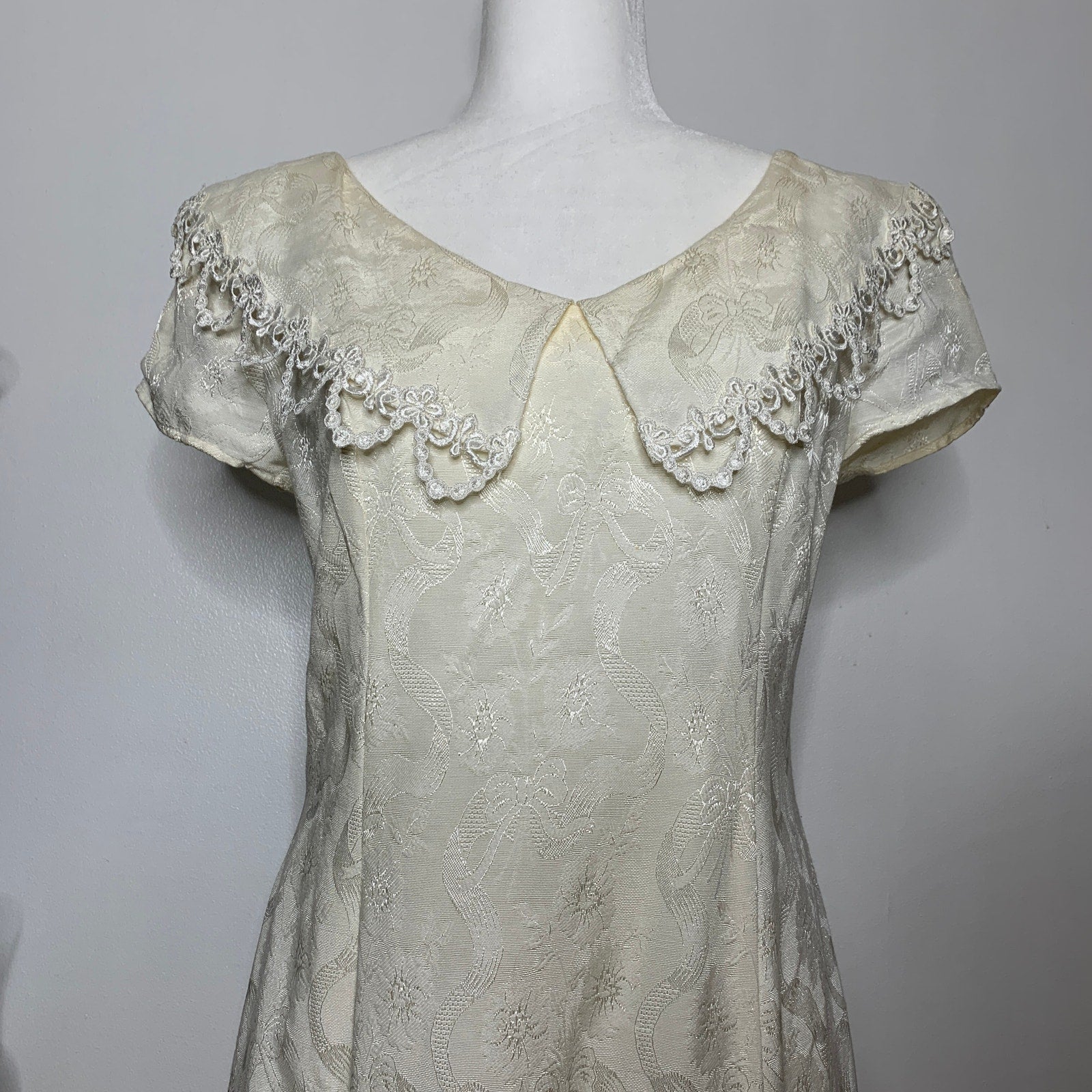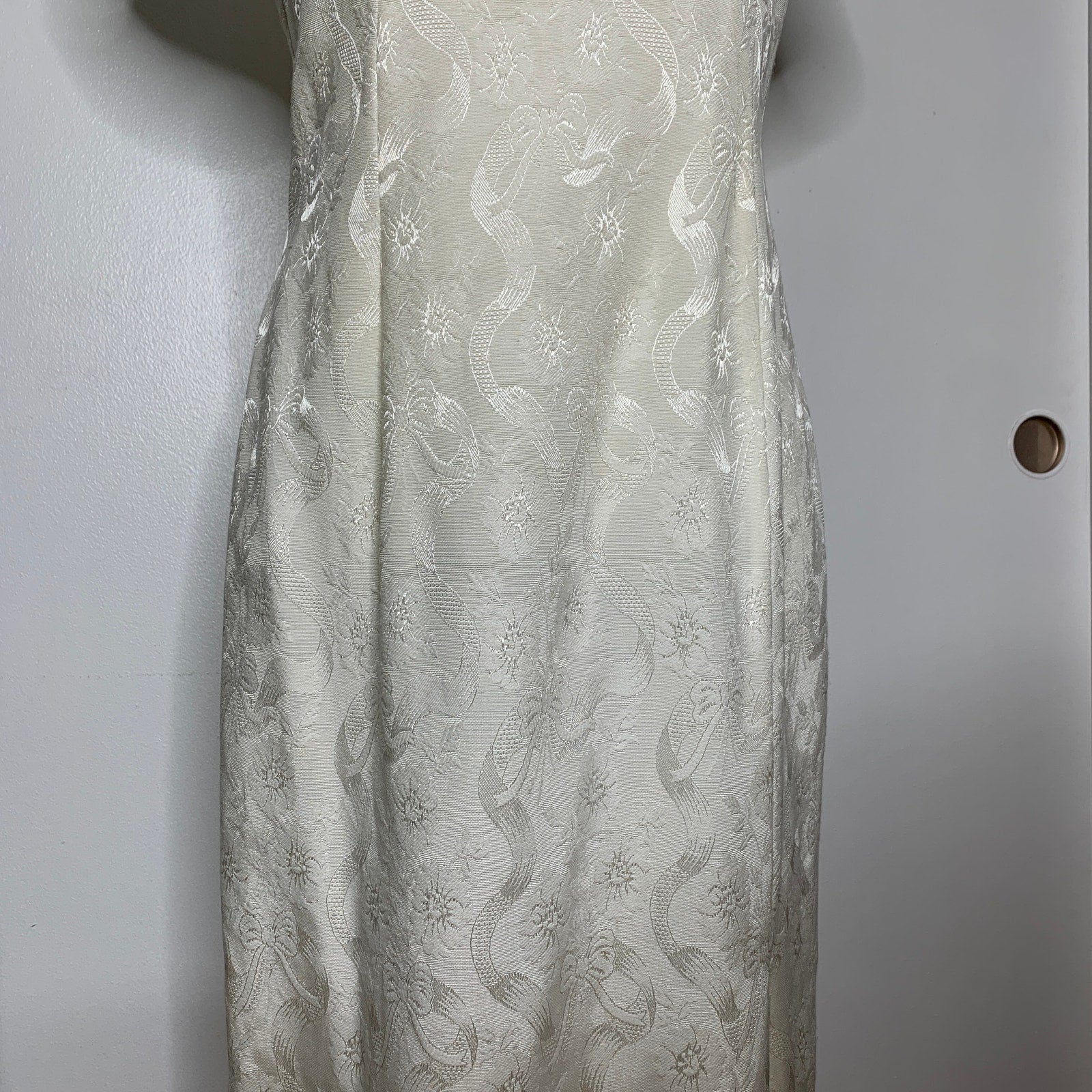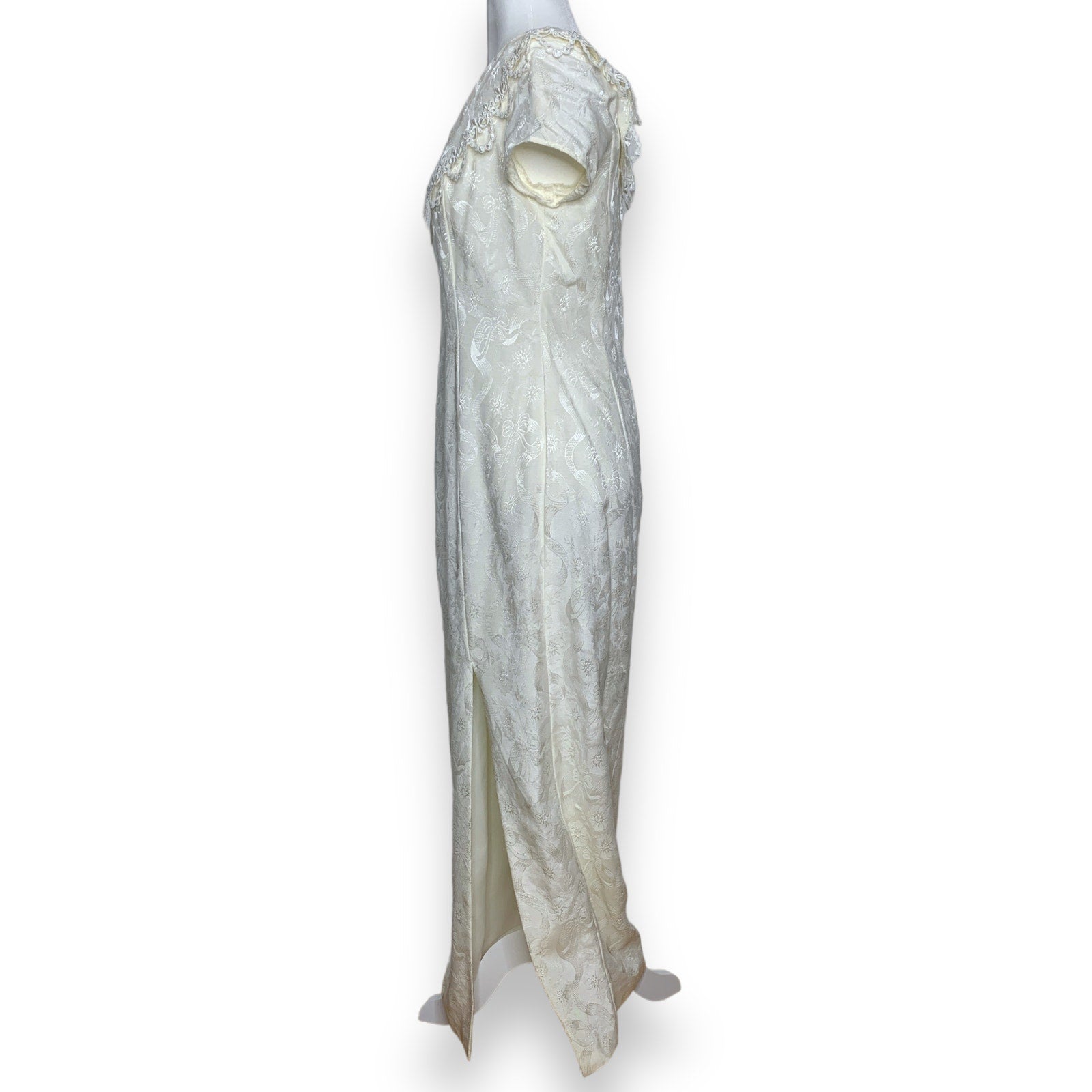 Vintage 90s off white lace trim jacquard fabric full length dress SZ M