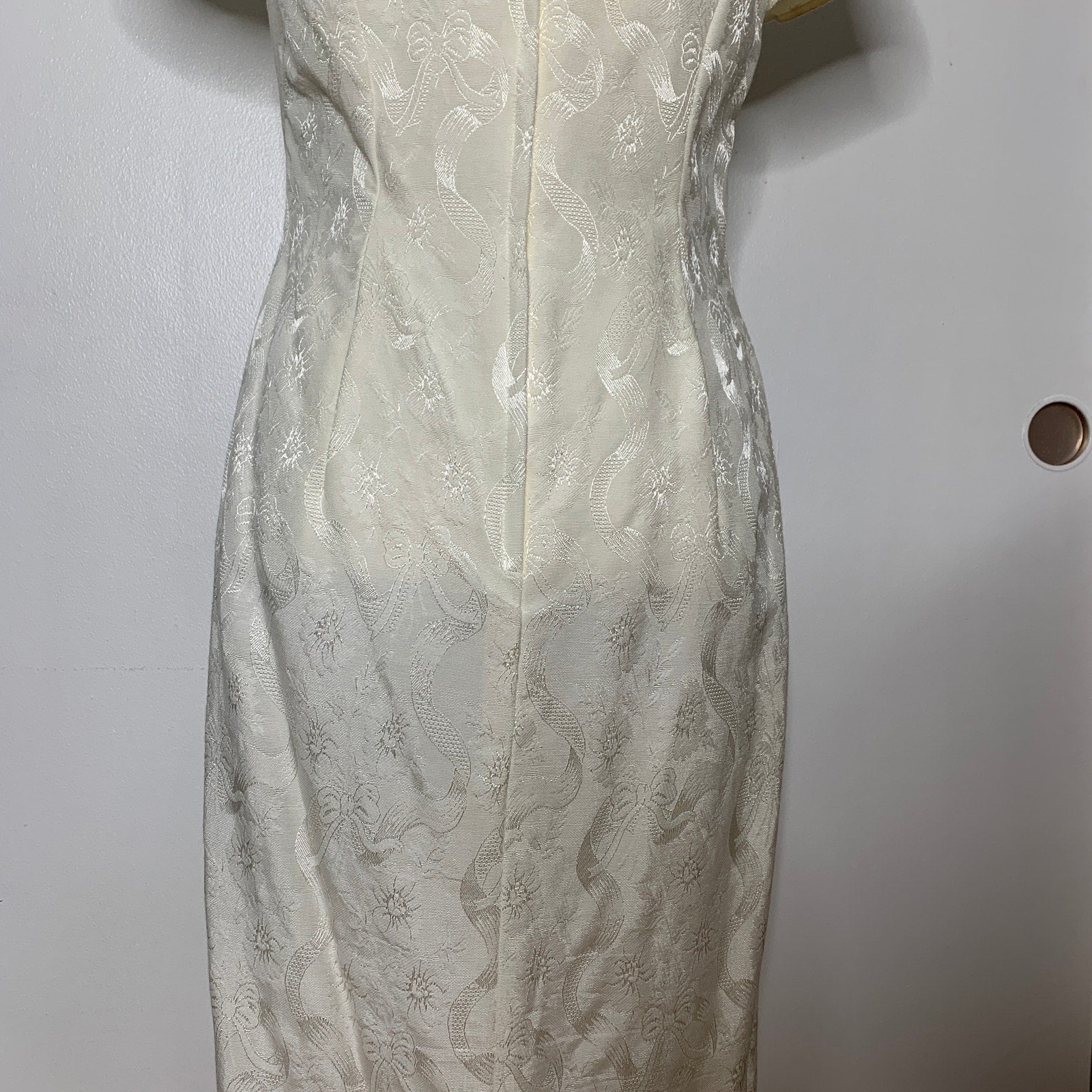A classic 90s Gunne Sax gown! This dress features a lace trim puritan collar and gorgeous off white ribbon, bow and floral embroidered jacquard fabric. The bodice is fitted with shoulder pads, short sleeves and a back zipper closure. The dress is cut in a classic floor length column silhouette with a side slit. The entire dress is fully lined.