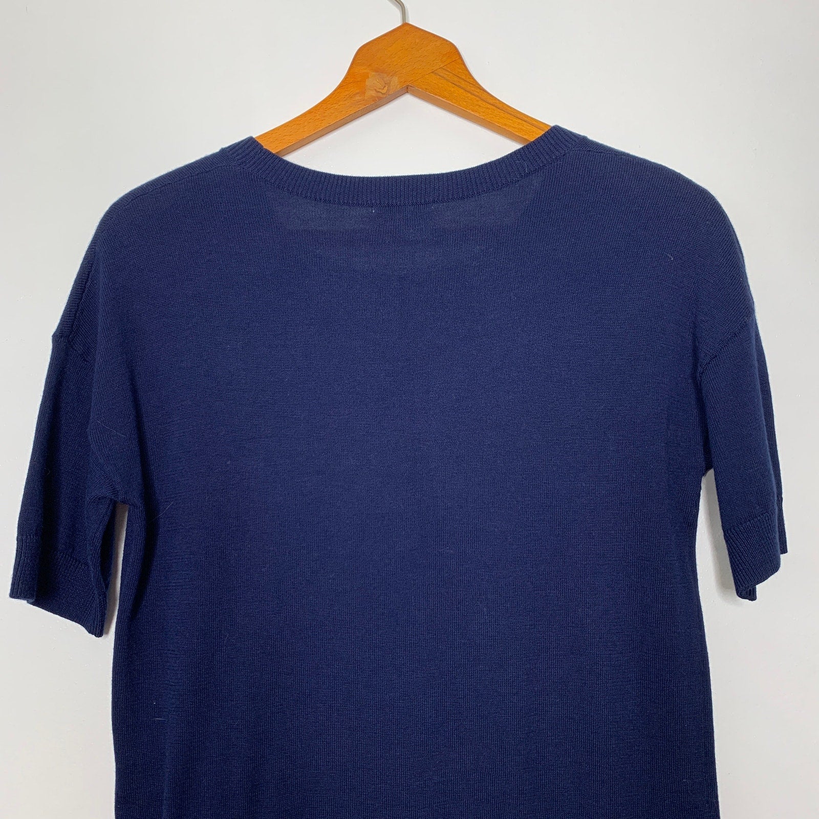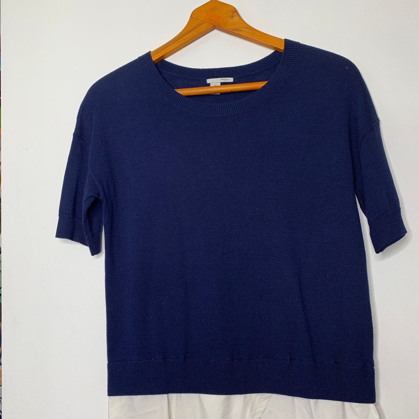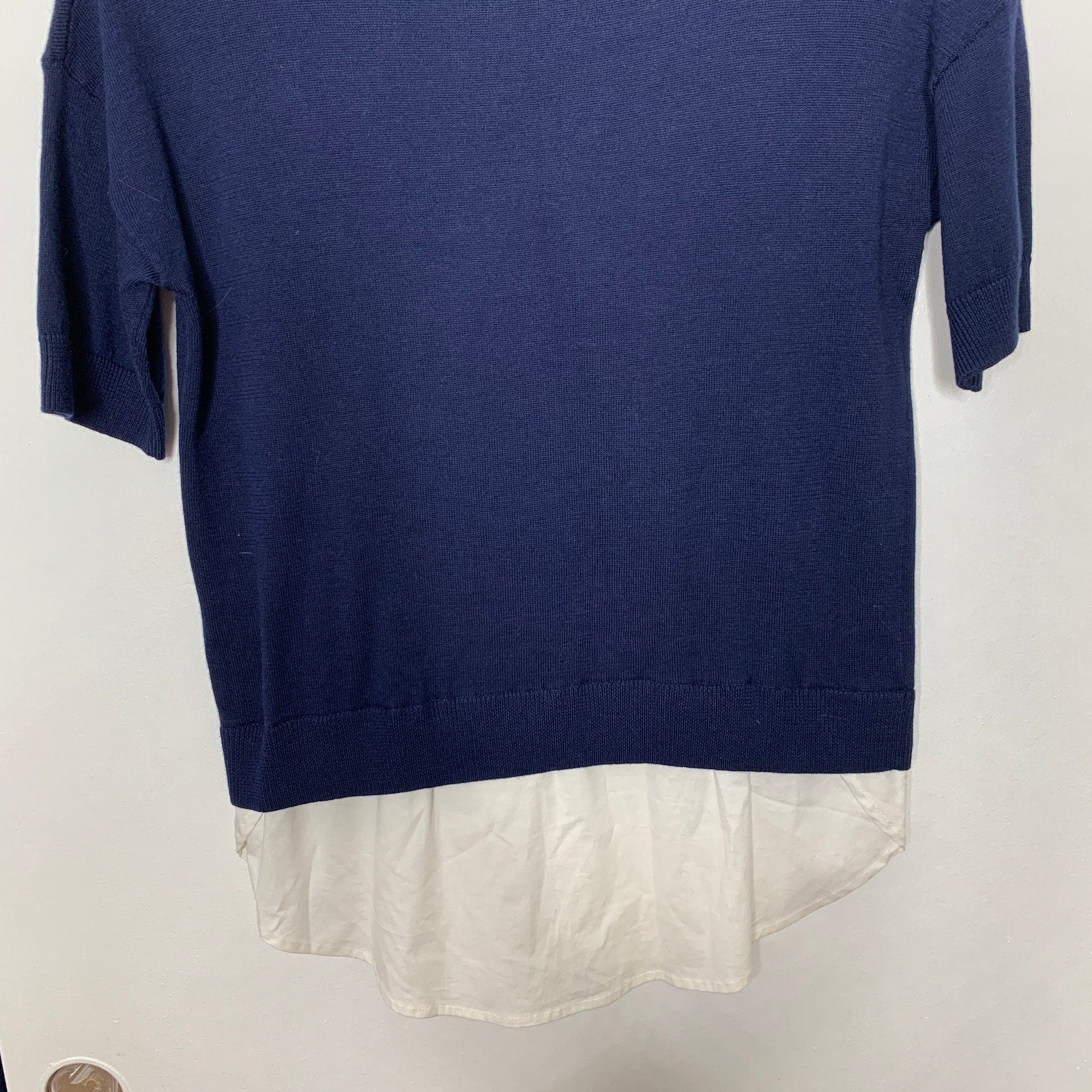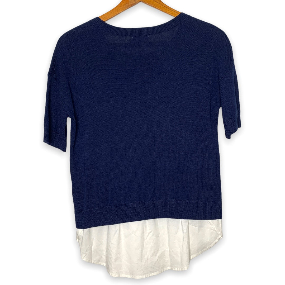 Get ready to turn heads with this Halogen navy blue layered sweater top! Featuring a flattering half sleeve and round neck, this top takes your style to the next level with its unique faux button down underlayer. Complete with ribbed knit trim, this top is the perfect blend of comfort and chic and is perfect for any preppy outfit or work day!