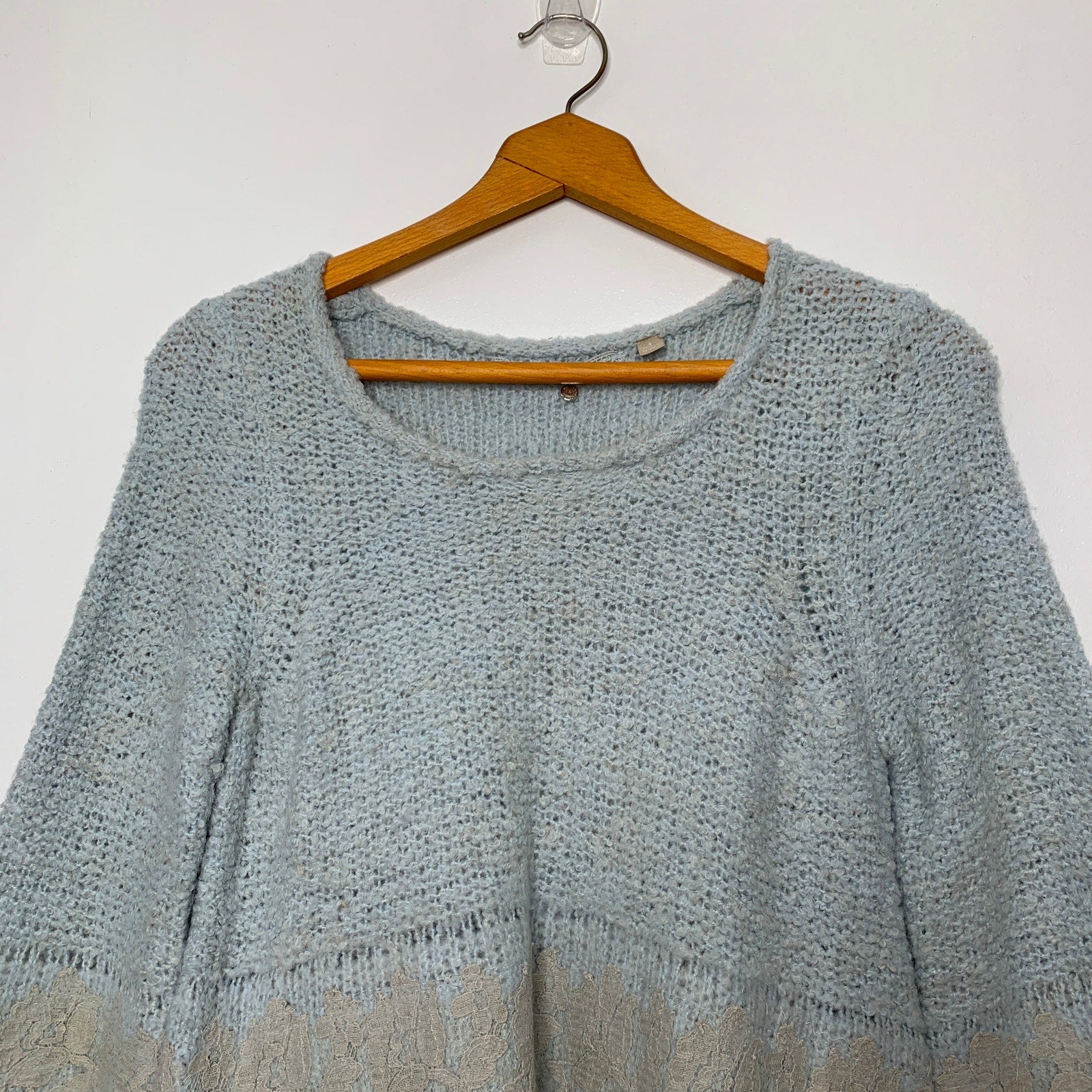 This Anthropologie sweater is the perfect mix of cozy and cottagecore chic! Made with a luxurious blend of wool, alpaca, and linen, it features a chunky knit design and delicate lace trim on the bottom and sleeves. The crew neck and three quarter length sleeves add to its flattering A-line silhouette. Soft and warm, this grandmacore sweater will be your go-to for chilly days.