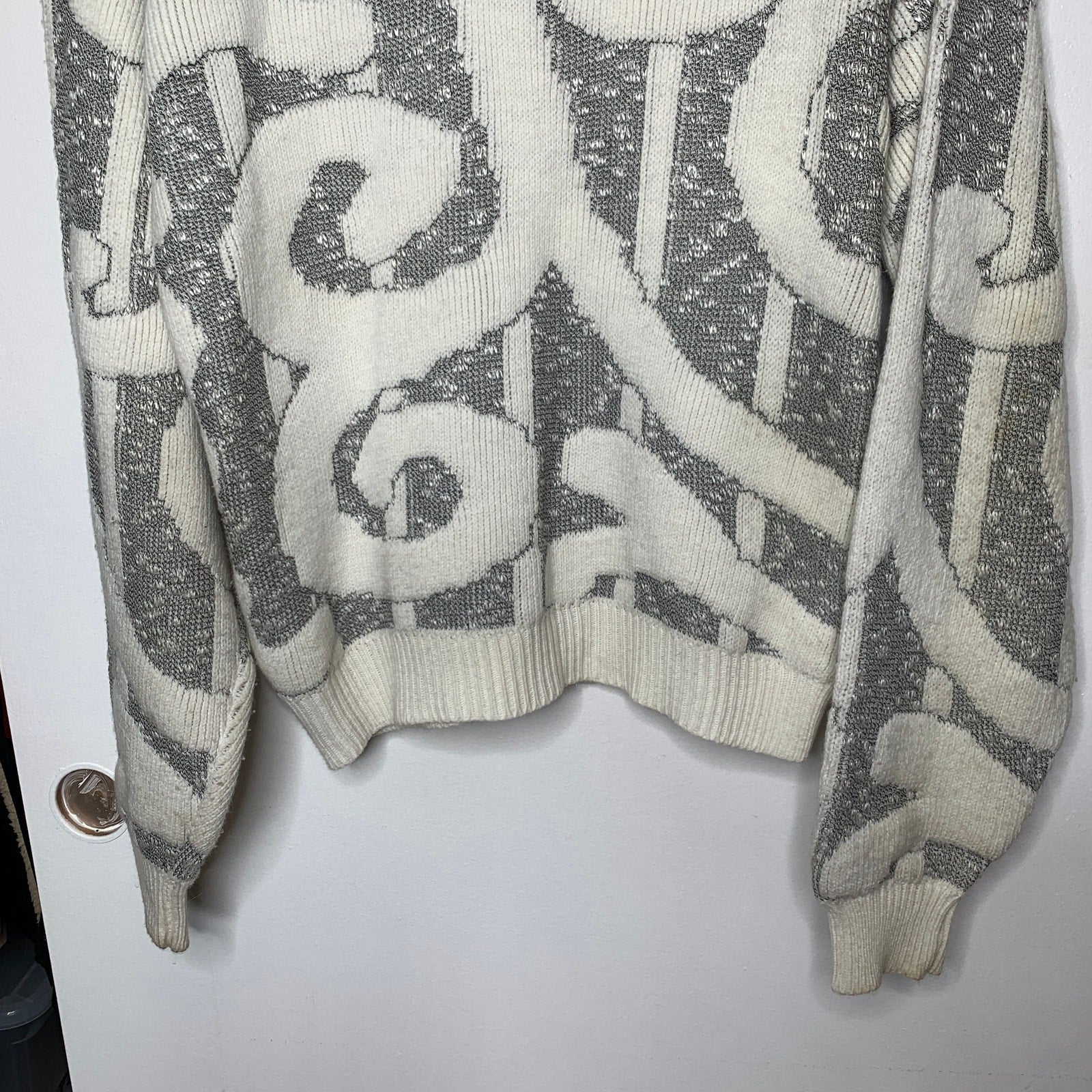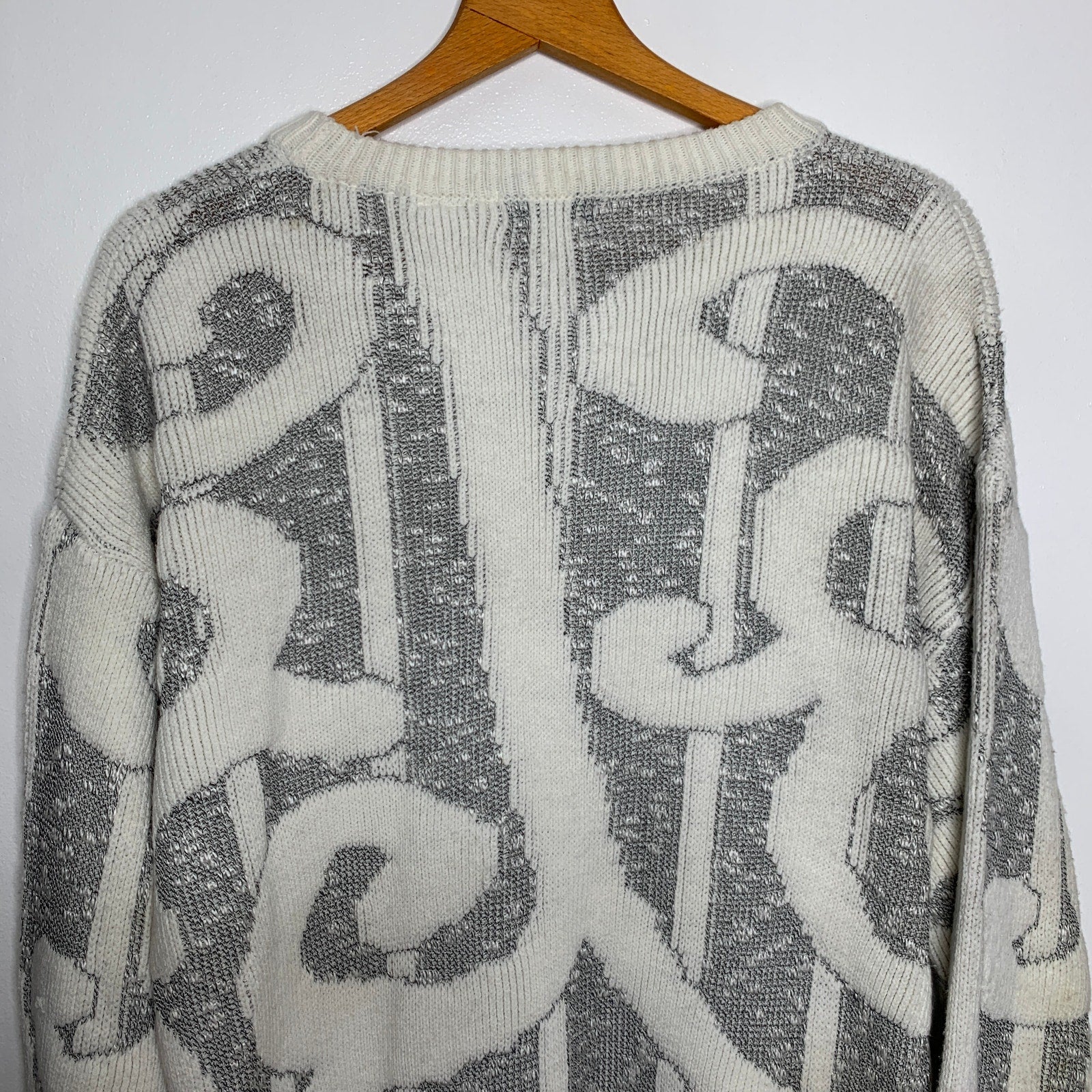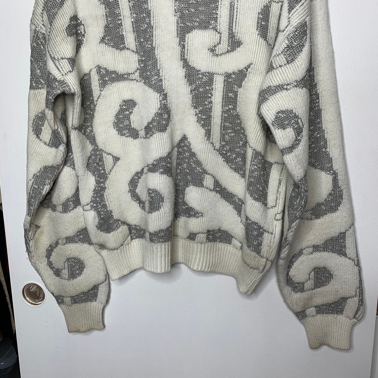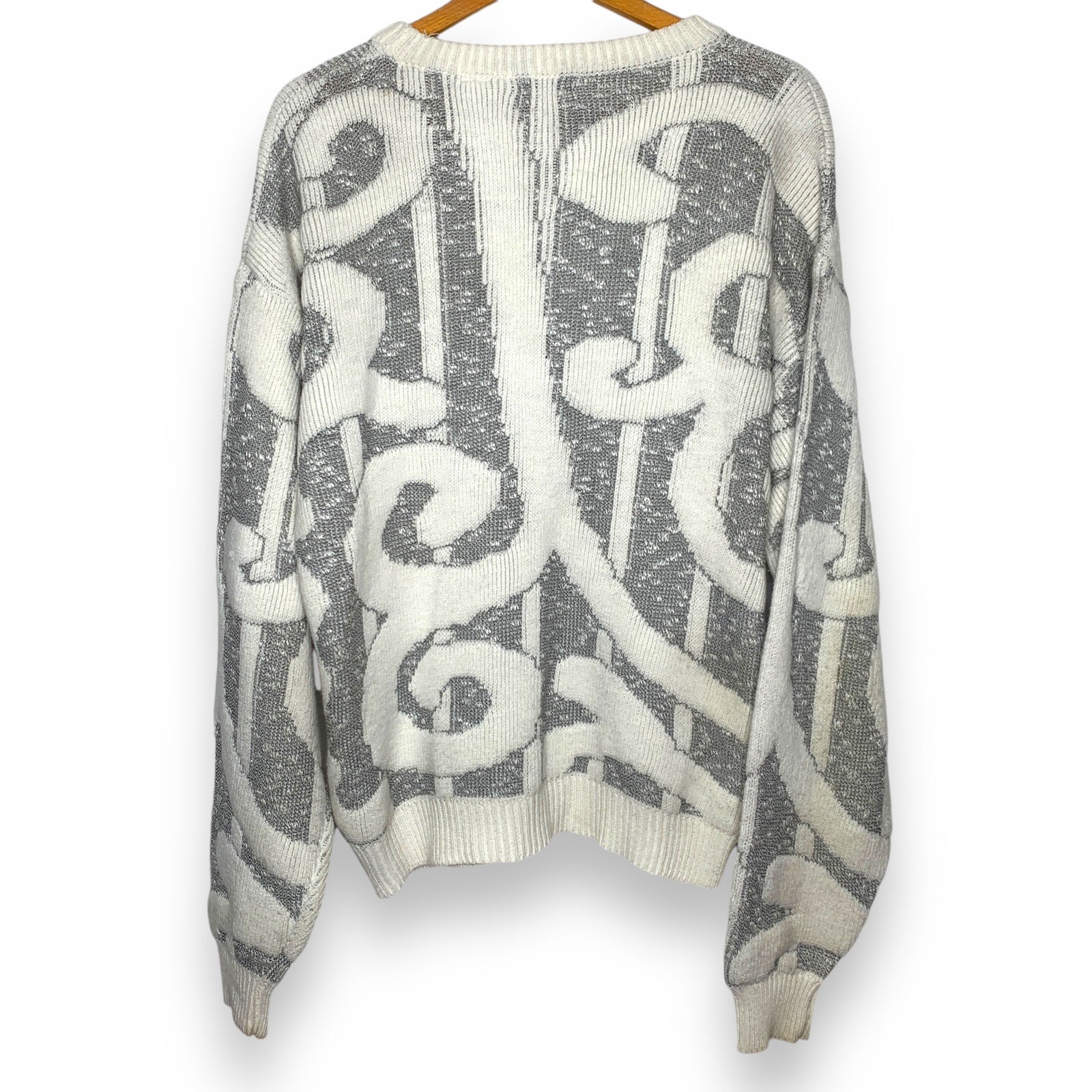 Step back in time with this playful vintage 90s Koman swirled chunky knit sweater. In a unique cream and gray color combo, this crew neck sweater features a textured chunky knit in a geometric stripes and swirl pattern that will make you stand out from the crowd. Perfect for cozy days or a fun night out!