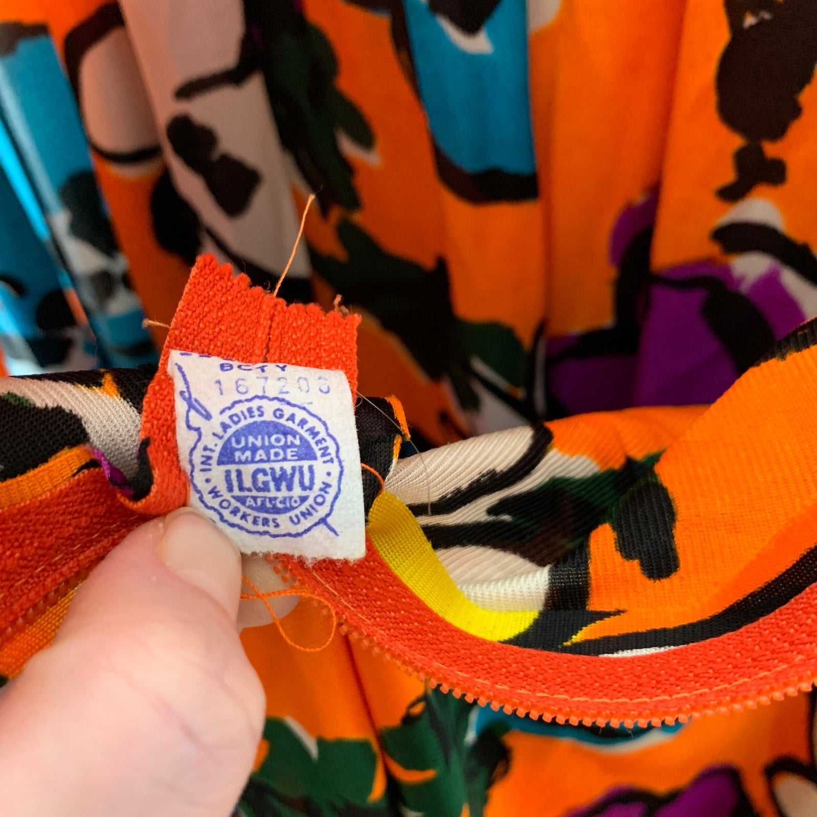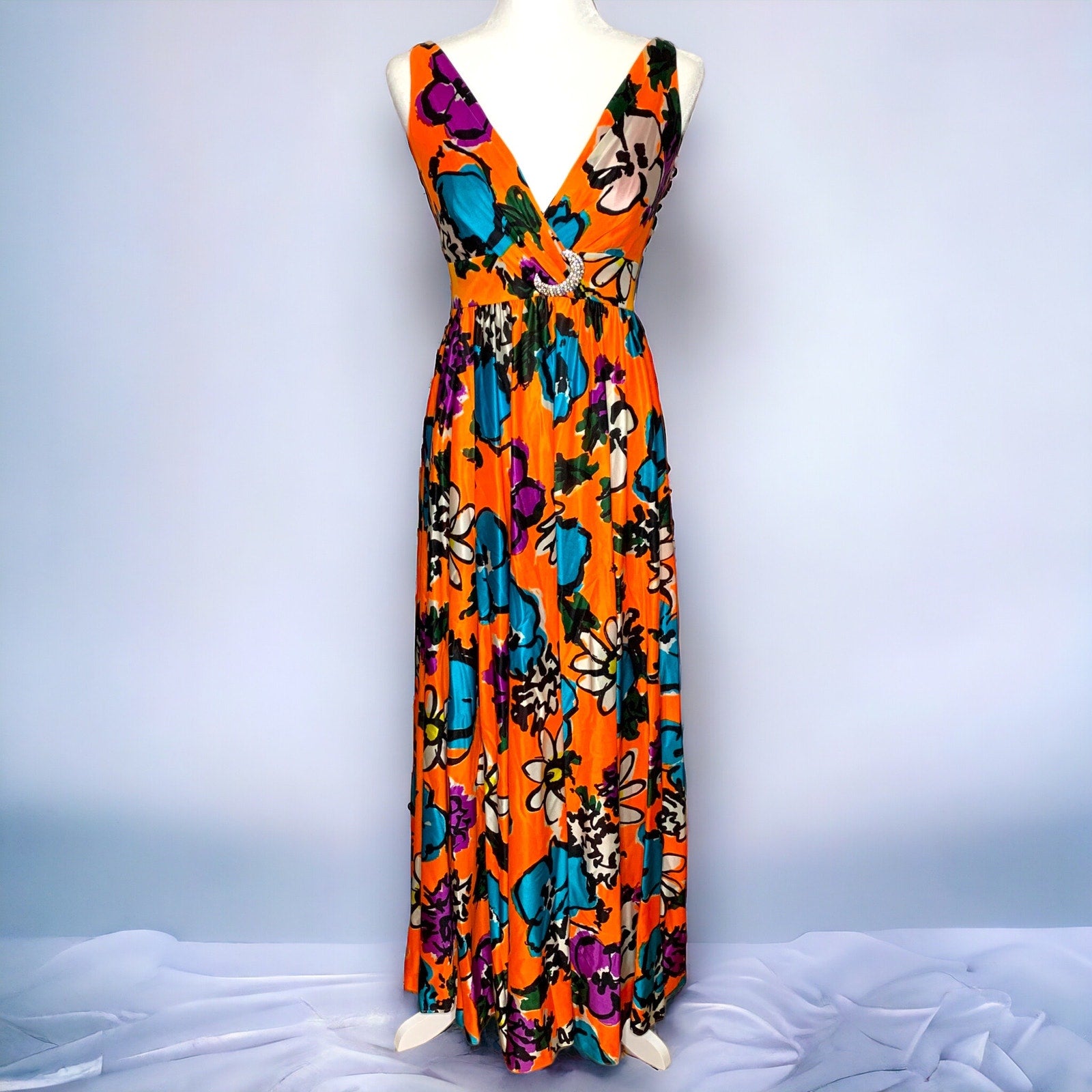 An absolutely stunning NEW WITH TAGS 1960s Fred Perlberg classic! This dress has a vibrant hand screen printed floral pattern on an ultra soft, silky fabric. Featuring wide straps, a wrap style bodice and an empire waist accented by a bejewelled crescent moon brooch. The bodice is lined with a hidden back zipper. The skirt is loose and flowy in a maxi length. Fred Perlberg's pieces are small batch in order to focus on quality and highly collectible, and this dress is no exception to his rule - you must be able to dance in it! The gorgeous gathered waist and A line silhouette create a beautiful twirl effect with tons of movement.