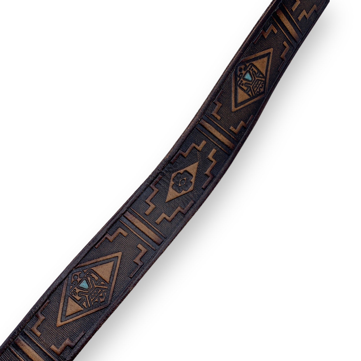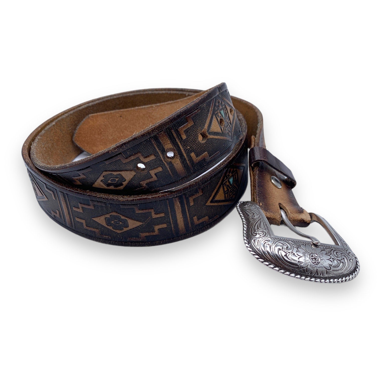 Step into cowboy style with this vintage men's brown leather belt, embossed with bold western or southwestern pattern that bring a rugged country charm to any outfit. The real 100% leather feels as authentic as it looks, while the engraved silver buckle and hardware add a shiny, eye-catching finish. Sized XL for a comfortable fit, this belt is ready to wrangle compliments wherever you go!