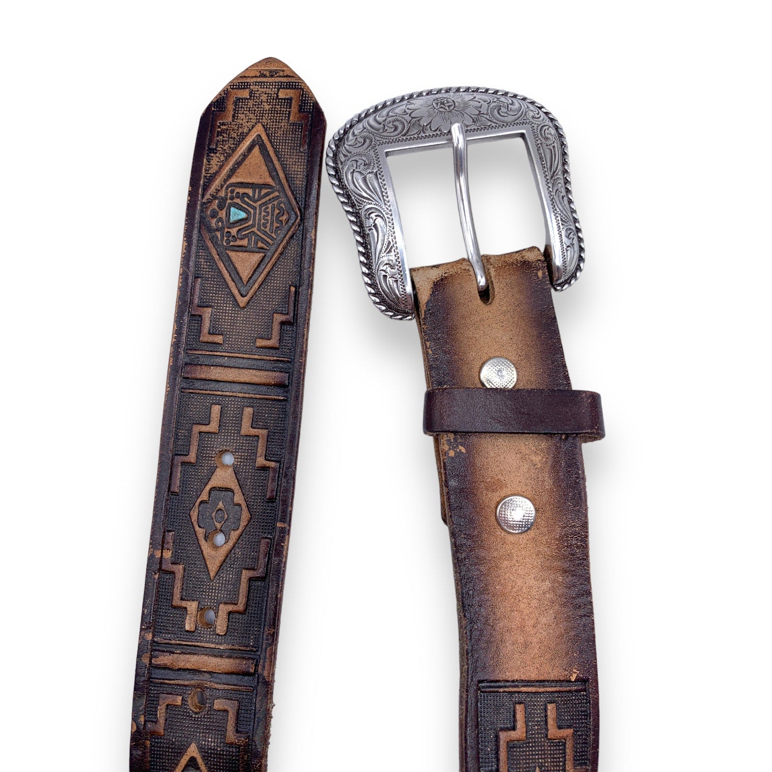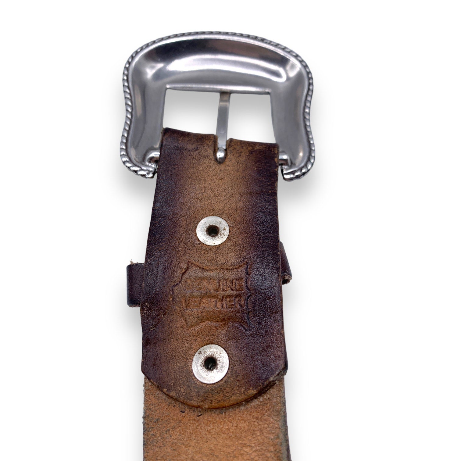 Vintage men's brown embossed western silver buckle real 100% leather belt SZ XL
